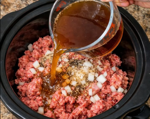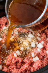 Place the diced potatoes, sliced carrots, chopped onion, and minced garlic into your slow cooker. Add the cooked ground beef on top.